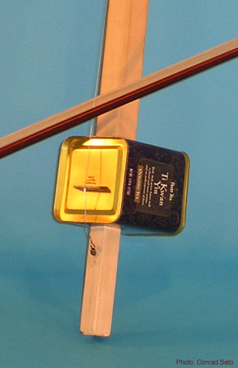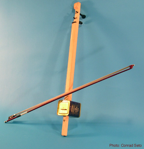 Inspired by the traditional Chinese version of the “stick” or “spike” fiddle; built by my student, Conrad Seto. The stick is from a folding camp bed, the strings are ordinary music wire. The bow hair runs between the two strings. As there is no fingerboard, the vibrating length of the string is stopped merely by touching it (free stopped). Instruments of this sort are found from North Africa all the way to Thailand and Japan. The bodies are generally made of gourds with stretched skin heads.